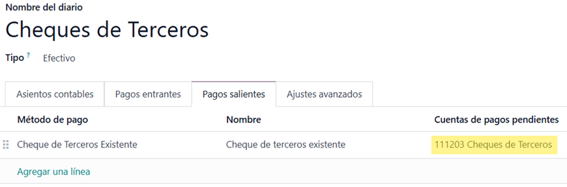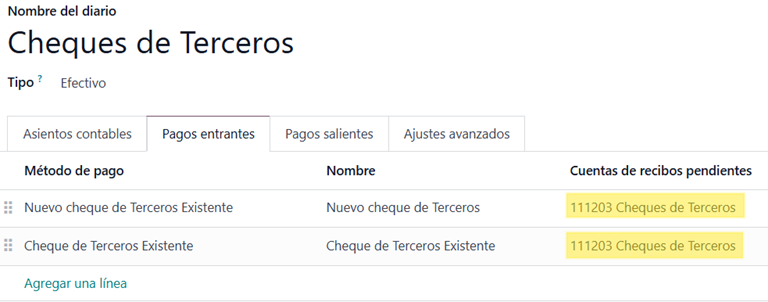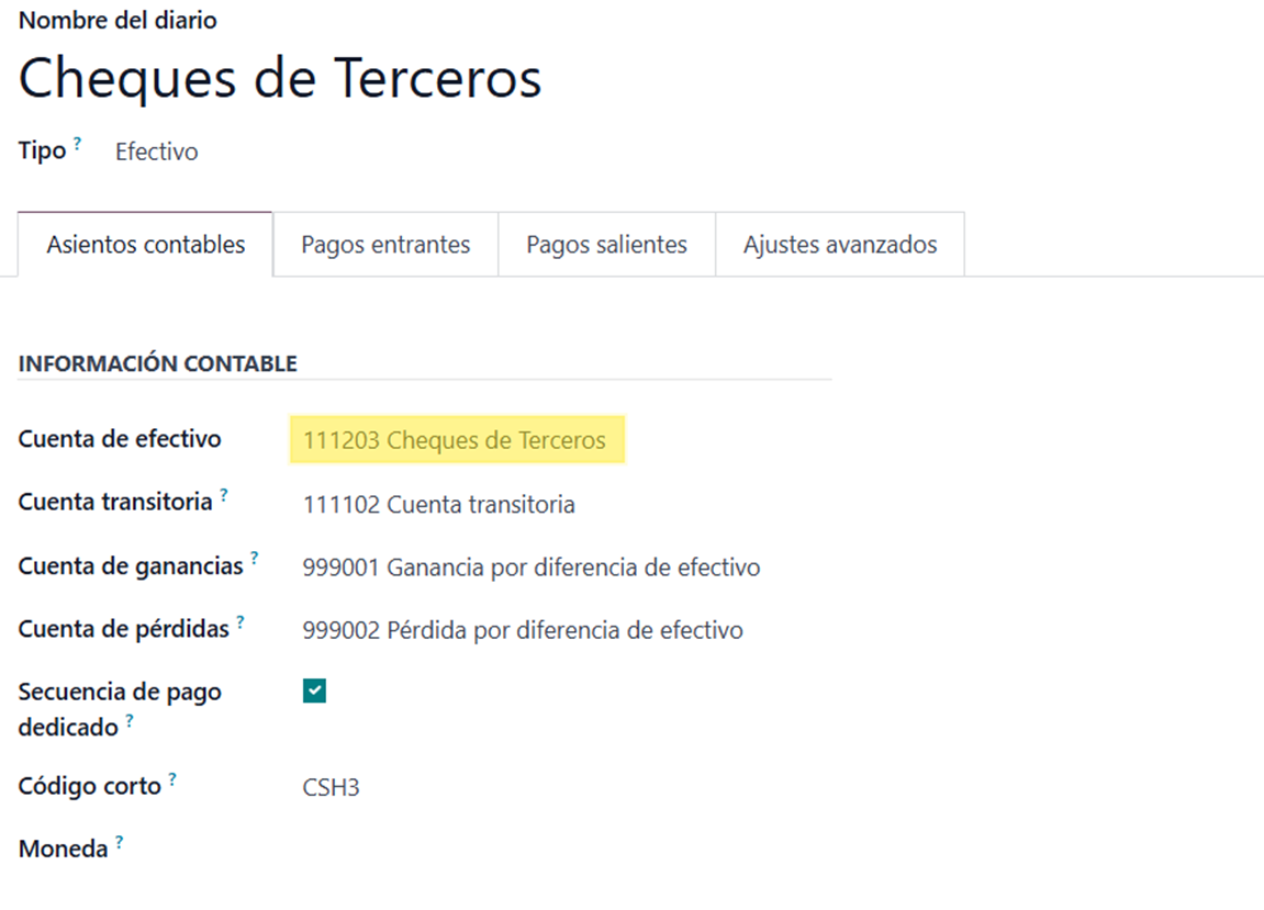 Once the module is installed, a cash-type journal is automatically created, named “Cheques de Terceros”, with an assigned account: