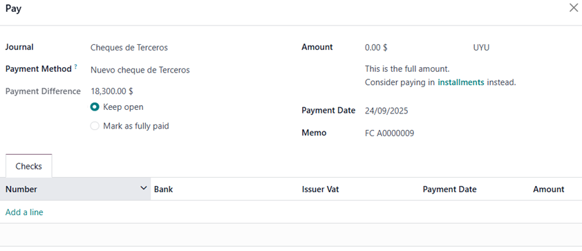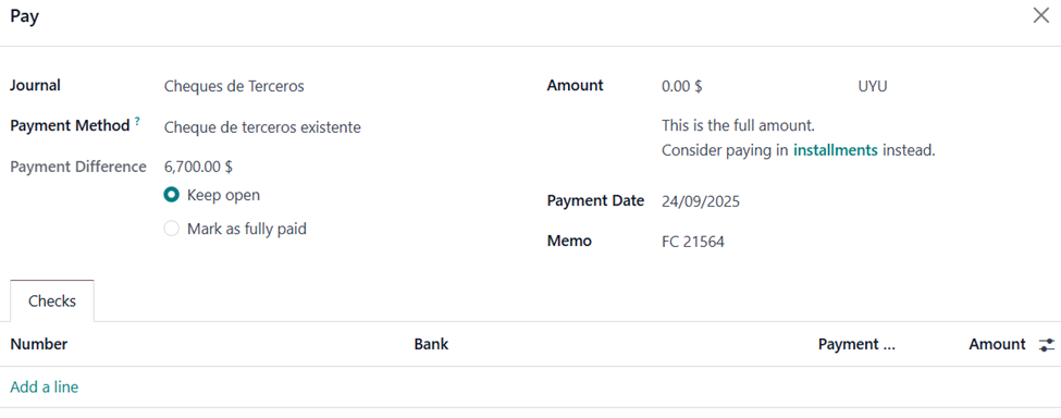 • When registering a vendor payment, choose the journal “Cheques de Terceros”: